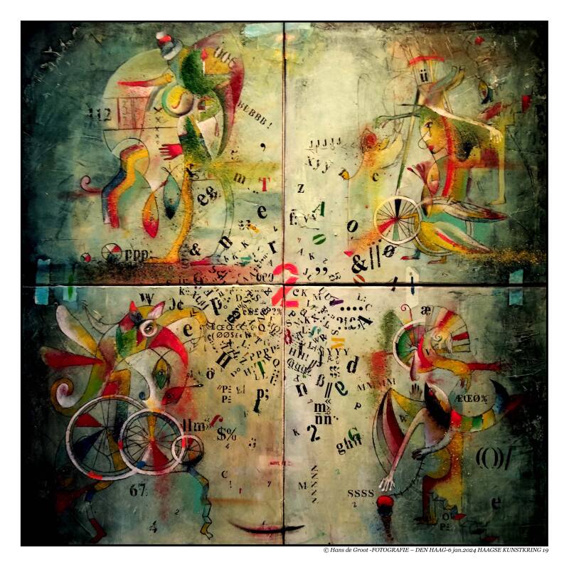 Ook dit werk van een kleine kunstenares die ik wel een paar keer gesproken heb,, sprak me wel aan vanwege haar compositie en kleurgebruik met gebruikmaking van getekende letters, cijfers en symbolen.