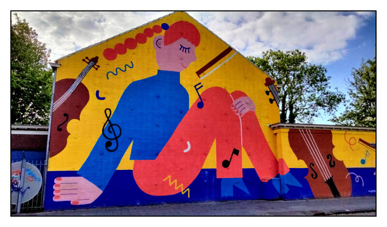 Hier mijn bezoek aan de Telemanschool waar ik altijd met veel plezier naar toe ben gegaan. Er zit een muzikant aan de want van de school die ik nog niet kende.