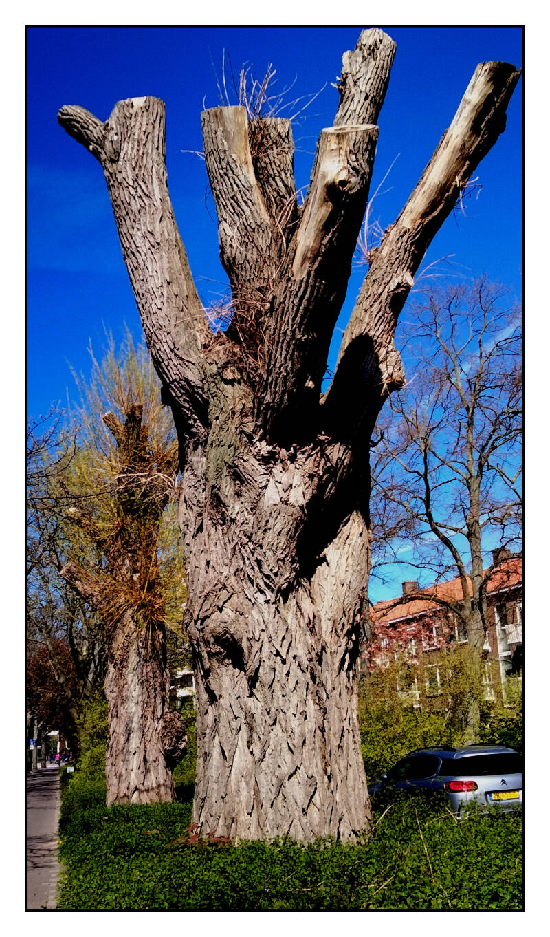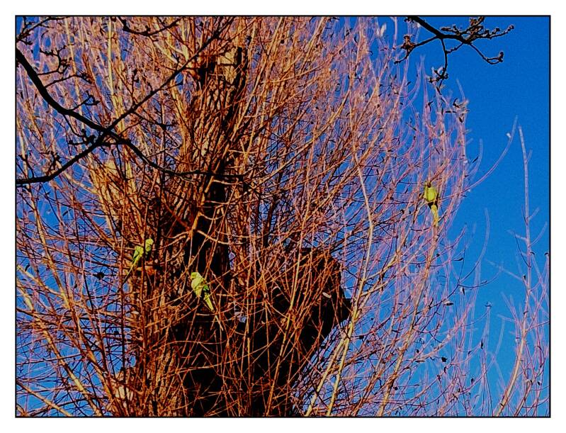 Often I also drove to the public library of Rijswijk on the way back from VDK, the place where I regularly make good quality prints of photodrawings. Striking images were of course the 2 ancient trees, of which 1 has now been removed. I thought it was beautiful and especially when I saw bright green parakeets on the branches. And of course this with a bright blue sky as a background.